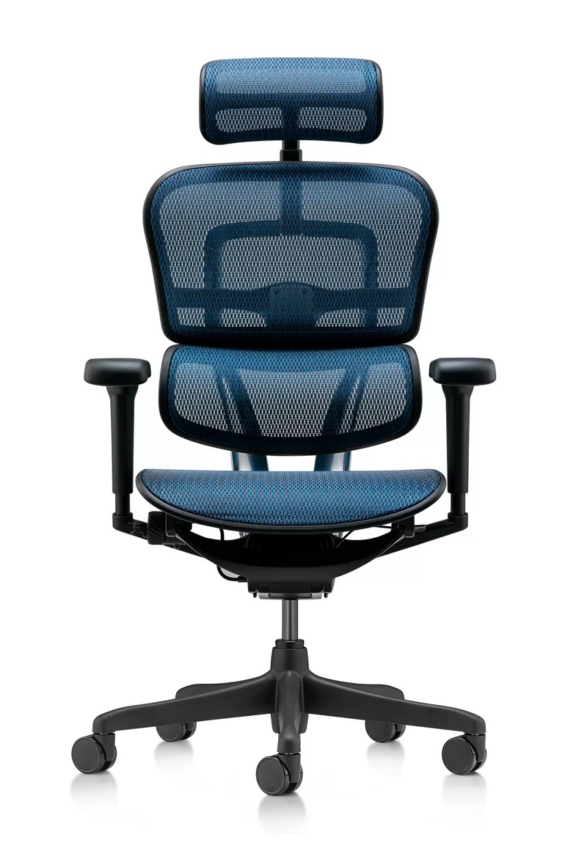 Ergohuman Ultra II vezetői forgószék | hálós háttámla és ülőlap | fejtámla | alumínium lábkereszt | fekete váz, kék háló