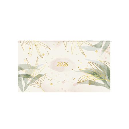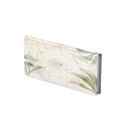 Színes grafikával díszített, matt fóliával bevont, fehér tömbös zsebnaptár, jelzőszalaggal.