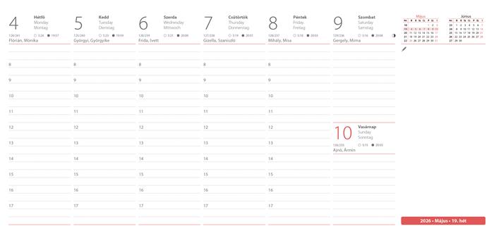 -összesített naptár; minden lapon két hónap az aktuális hét megjelölésével