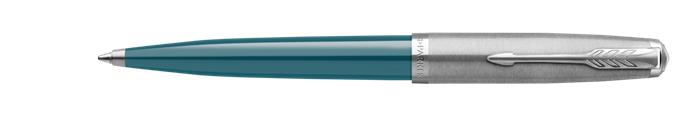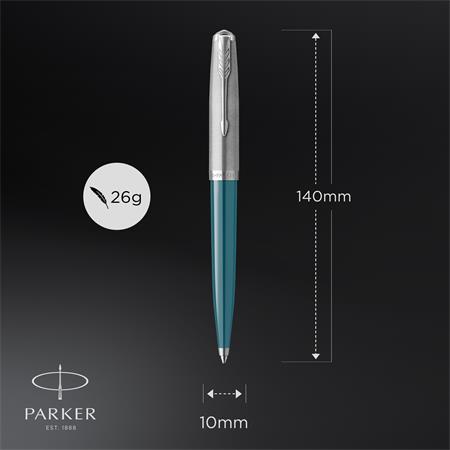 Golyóstoll, 0,7 mm rotációs, ezüst színű klip, türkiz tolltest, PARKER Royal 51 Core, fekete
