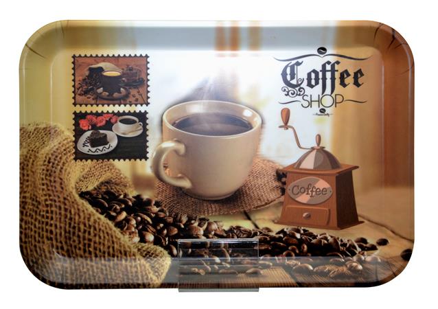TÁLCA, SZÖGLETES, MŰANYAG, KÁVÉHÁZ MINTÁS, 21X14 CM